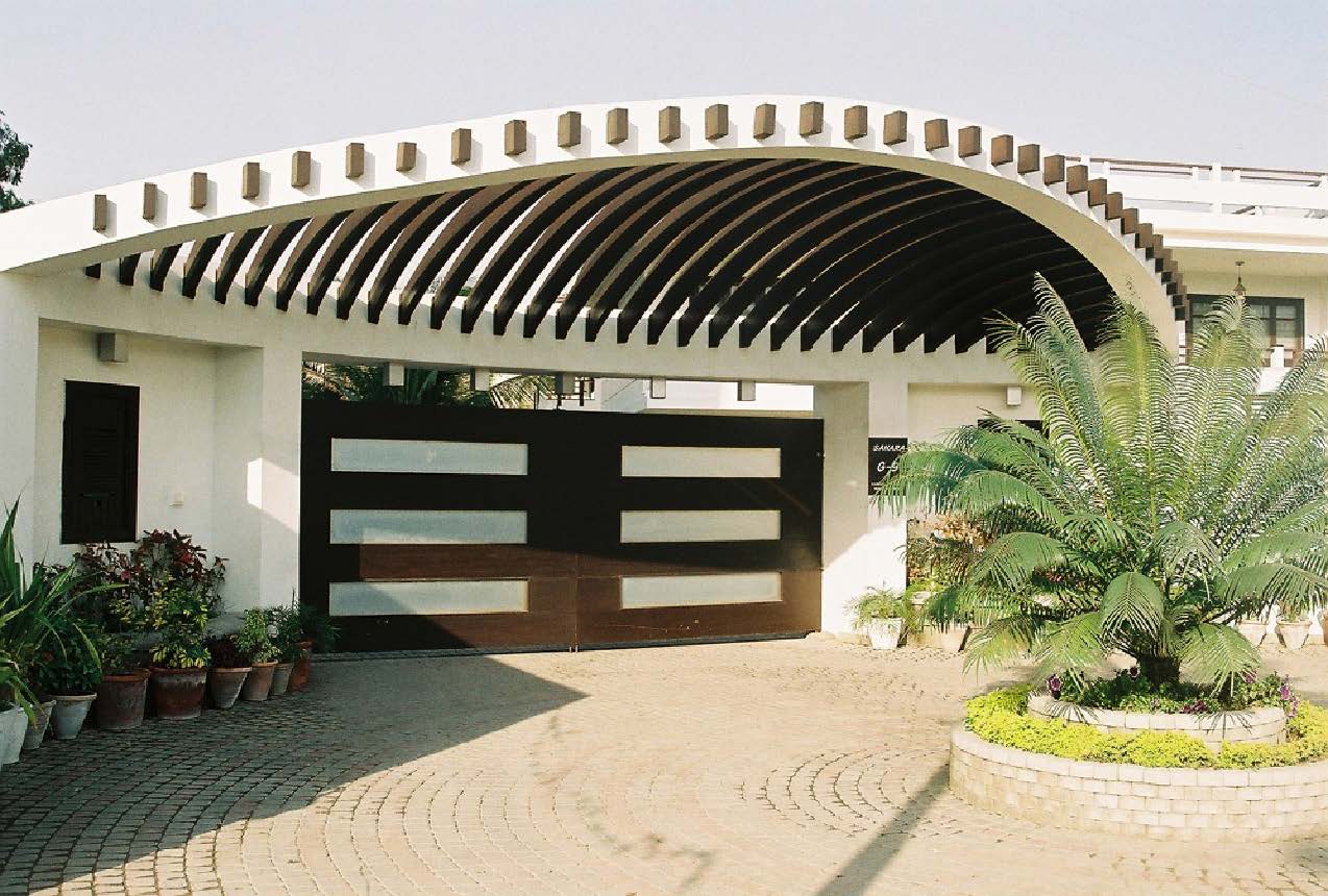 The peak is known for its expertise through innovative design, structure and implementation of fresh new ideas through testing and trials. However,constructed in the early May of 2005, the project showcased here takes us down the memory lane, revisiting the design and techniques integrated to the approval and satisfaction of the client. Situated in the heart of Clifton block 9, just a right turn from the monumental Do Talwar, the curved, shell shaped gate grabs our attention at the first glance from far away. The visually inviting design of the gate breaks the monotony of the road creating a barrier between the two distinct lines of the road and the plot simply by the implementation of a palm tree just inside the verge of the line, providing the owner with their own personal dropoff and parking space without disturbing the traffic flow.