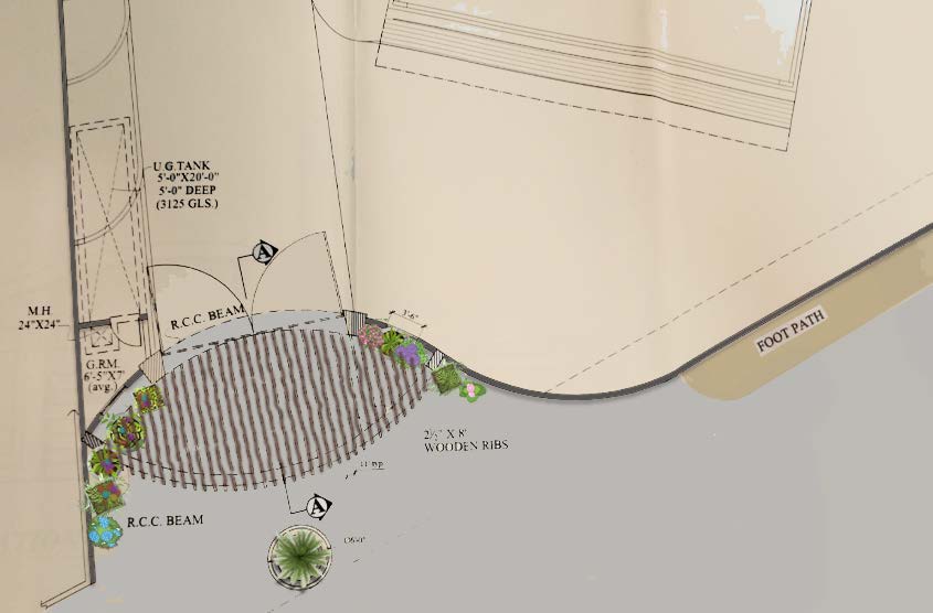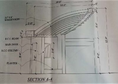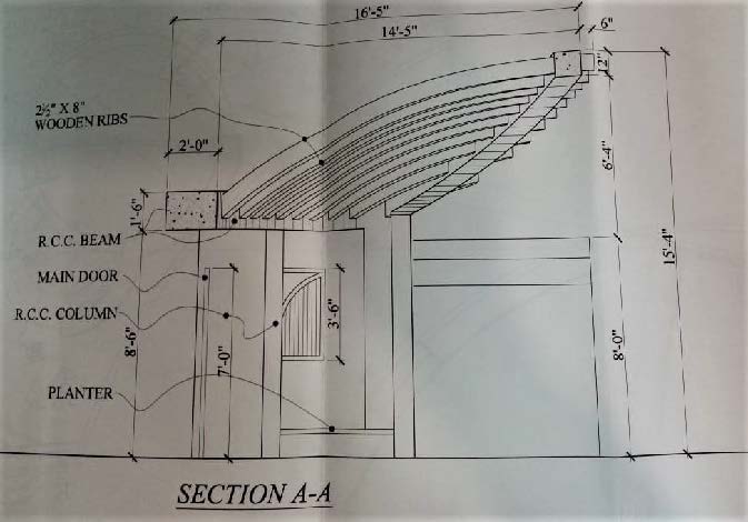 The span of the gate allows not only the users but also the viewers to experience the dominance it exudes with its curved cantilevered projection at a height of 16’-0” from ground and spanning around 17’-0”. The area methodically worked out to create enough space for the circulation as well as parking.The problem solving approach successfully produced results aesthetically as well as structurally with the use of RCC columns, wooden ribs in the projection held together by