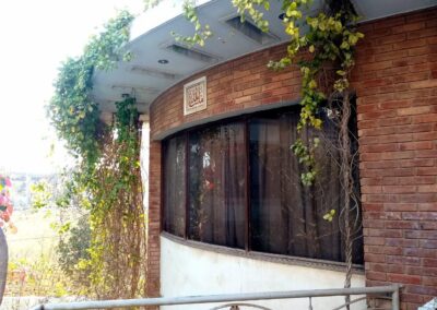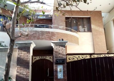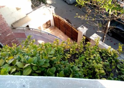 The parallel massing according to the zoning paves way for a vertical green passage connecting the lawn decorated with plants, upwards to the terrace on the roof floor that is wrapped with creepers. The lawn is enhanced by the curve traveling vertically creating a flow of motion cut off by a jutting 20’-0” cantilevered terrace on the rooftop which overcomes structural standards, becoming a place for recreation and reflection. The part of the house most loved by the occupants.